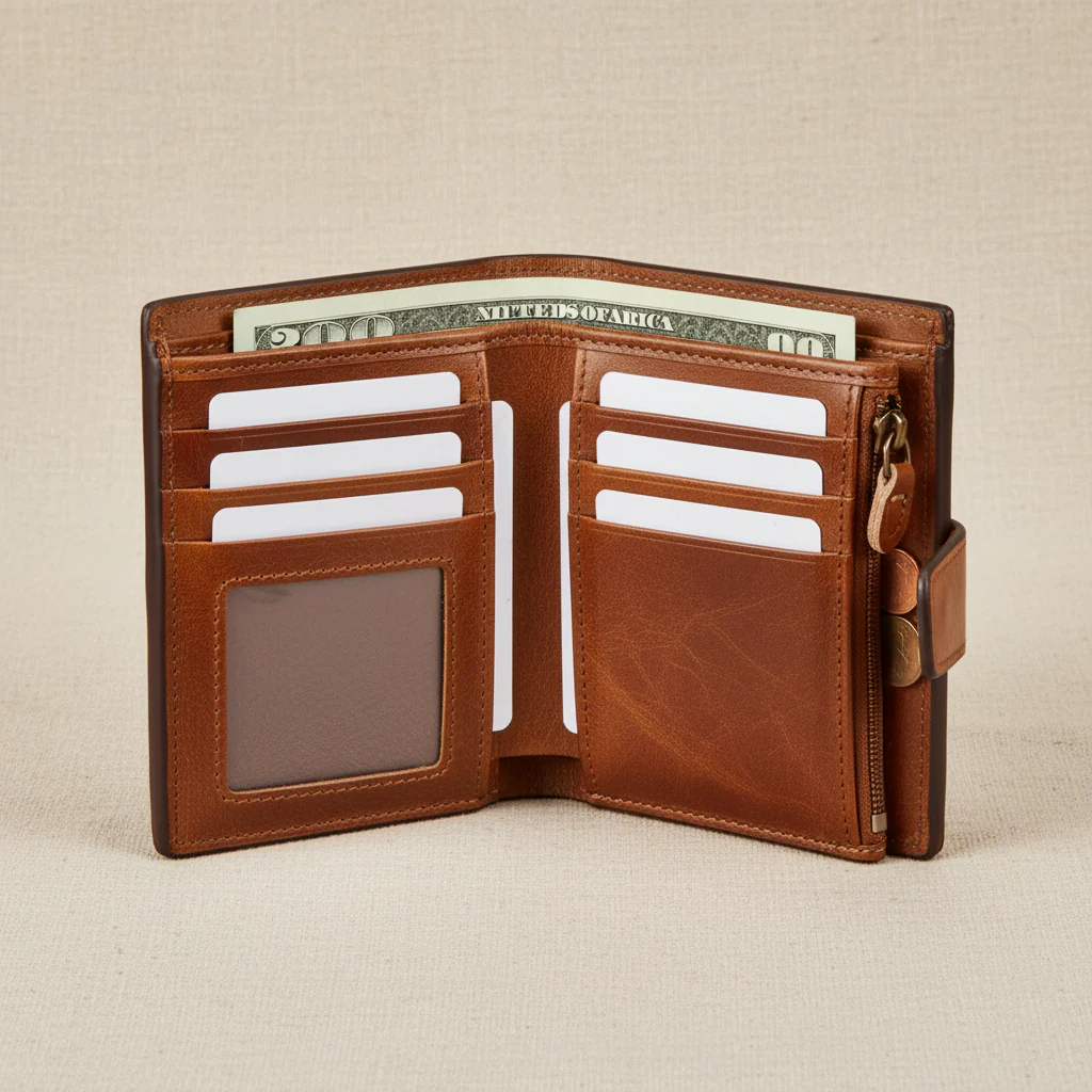 Den genomtänkta vikdesignen gör plånboken både bekväm att hålla och enkel att använda. Med generöst med kortfack, ordnade sedelfack och säkert RFID-skydd är Veloria utformad för att ge struktur, säkerhet och stil – en pålitlig följeslagare som passar perfekt i din vardag.